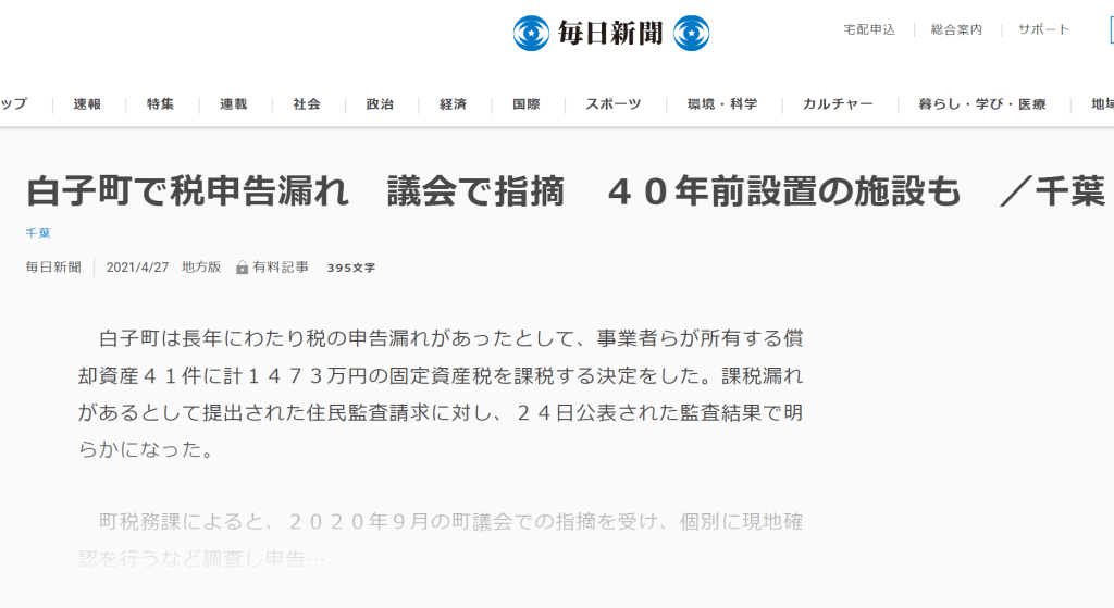 令和3年4月27日付の毎日新聞で私たちが追及してきた白子町における前白子町副町長、白子町議会議員らに対する固定資産税不正免除問題が報道されました。