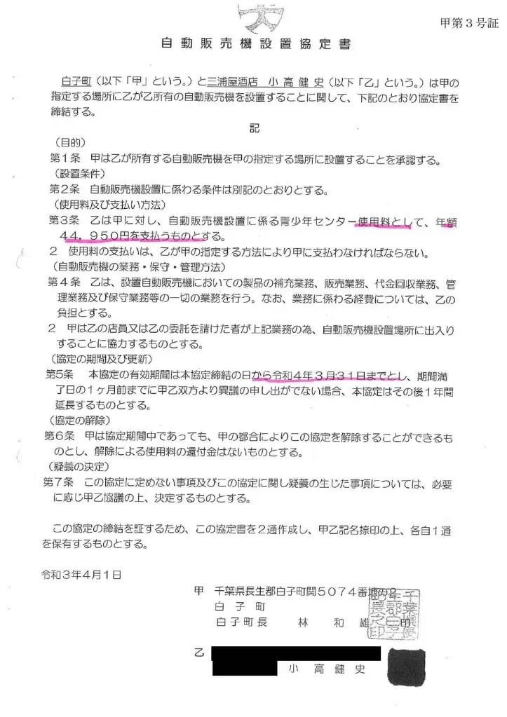 【 白子町長により開示された行政文書 】『 自動販売機設置協定書 』