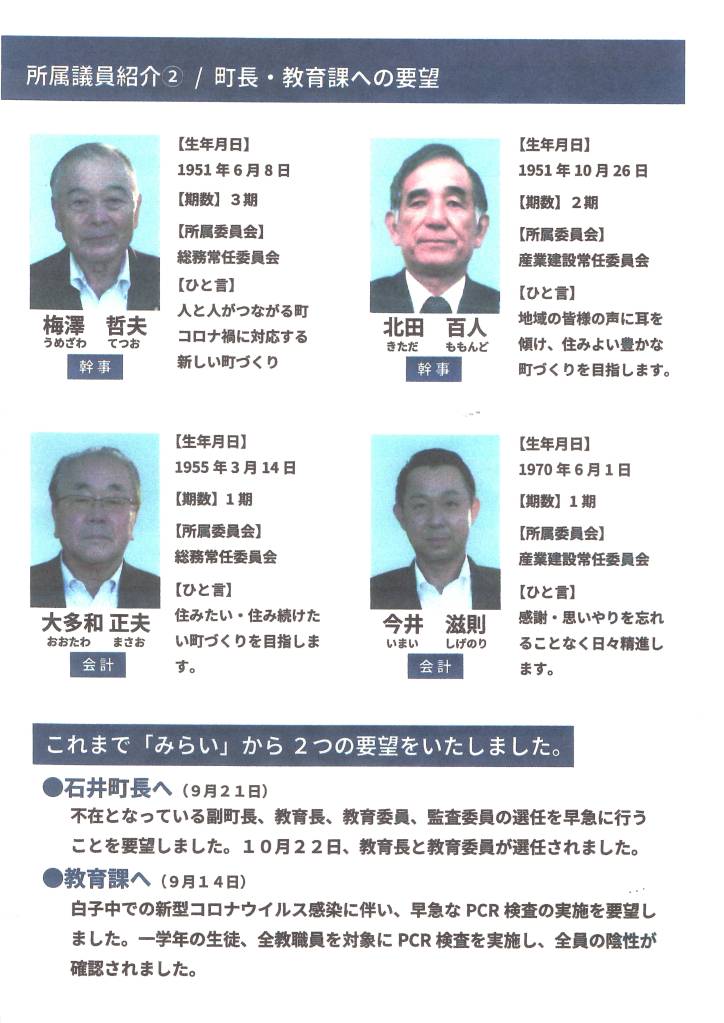 令和 3 年 8 月 2 日 会派 ” みらい ” が結成されました。白子町民に広く配布された会報みらい( 令和 3 年 10 月 vol 1 )を紹介致します。