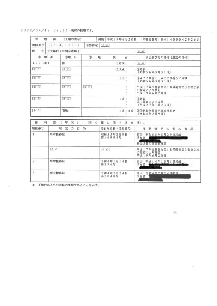 ❶平成 14年(2002年)10月 1日相続により、幹部職員 ”A氏”に所有権が移転している❷令和 4年(2022年)2月 9日に地目は従来の”田”から”宅地”に地目変更されている。❸令和 4年(2022年)2月24日売買により当該土地の所有権は幹部職員”A氏”より他者に移転している。❹当該土地は平成14年10月1日~令和4年2月23日迄の 18年4カ月余りの間、幹部職員”A氏”の所有土地であった。幹部職員”A氏”の長期に渡るコンプライアンス違反が公的証拠により明らかとなっている。