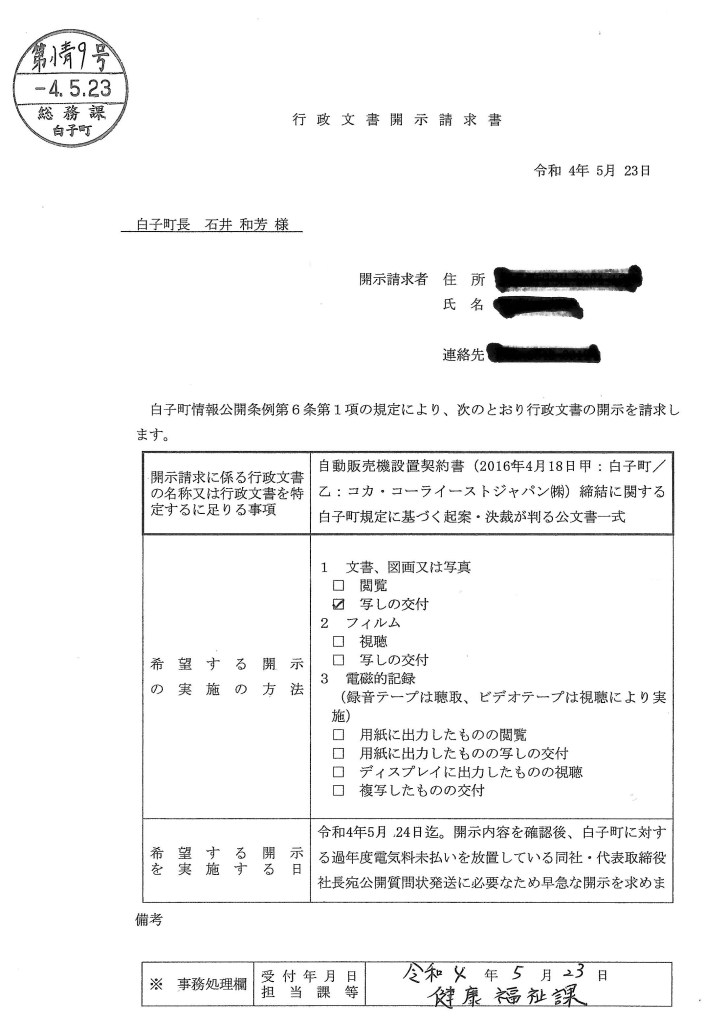 常識的に考えて、契約締結直後から 4年 5カ月に渡り電気使用料のみ未回収なのは極めて不自然です。同社との契約締結時の白子町の起案、申請、決裁の過程がわかる行政文書の開示請求を本日実施しました。