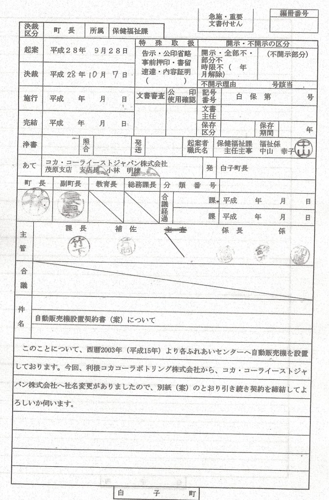 ❶ コカ・コーライーストジャパン㈱との契約( 2016年/平成 28年 4月 18日 )に関する 白子町規定に基づく起案・決裁が判る公文書一式の開示請求(再度開示督促)。