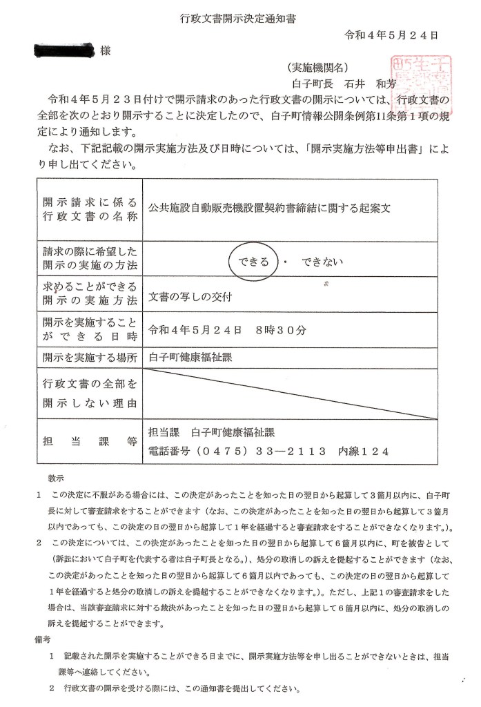 <66>【 自販機設置契約/コカ・コーライーストジャパン㈱ 】〔契約締結に関する起案・決裁公文書開示請求〕既報通り、自動販売機設置契約書(2016年 4月 18日 甲:白子町長 林 和雄 乙:コカ・コーライーストジャパン㈱)締結に関する白子町規定に基づく起案・決裁が判る公文書一式の開示請求を昨日( 2022 年 5月23日)行いました。