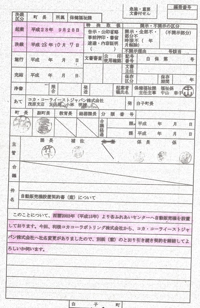 利根コカコーラボトリング㈱と白子町との自動販売機設置契約( 2003年/平成 15年 契約 )及び販売手数料、電気使用料がわかる資料の開示請求を本日(令和 4年 5月 25日)実施しました。回答を待って続報致します。