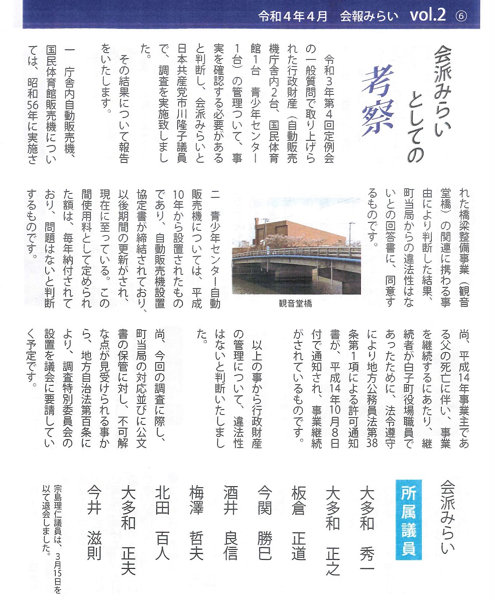白子町議会会派みらいの一員である今関勝巳監査委員。先日会派から出された会報には「会派みらいとしての考察」なる記事が掲載された。自らが監査委員として関与している本件自販機無償設置問題の適法性について、当会や前町長、A氏ら関係人の意見陳述前にもかかわらず前町長や職員らの責任を不問とし、「違法性はない」といった「判断」を行い公表した。