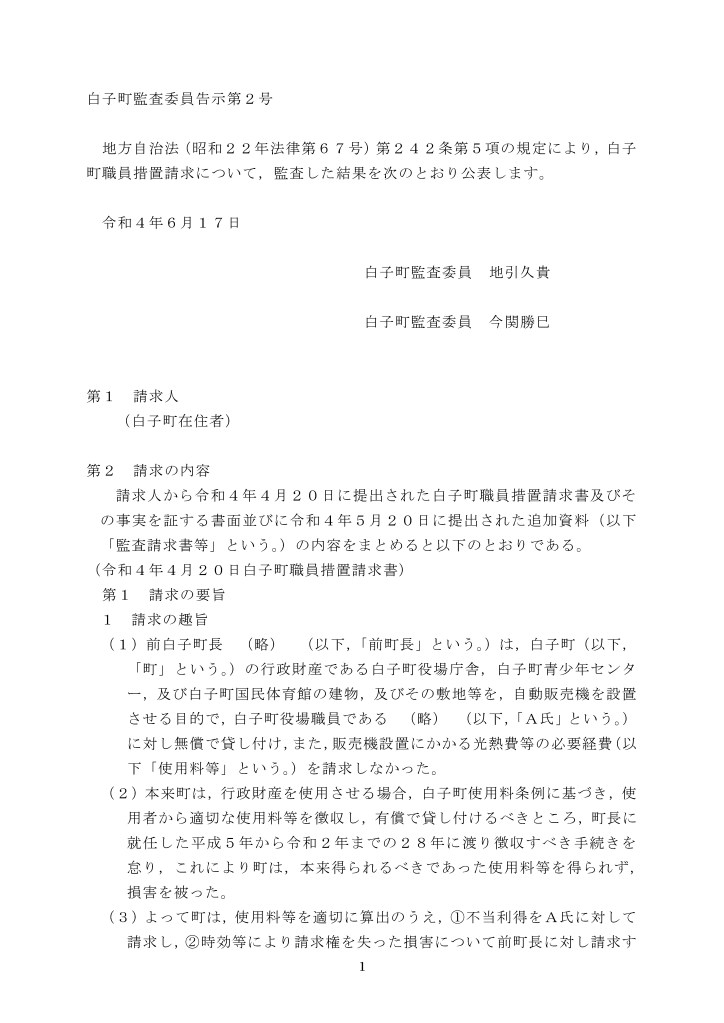 令和4年6月17日、白子町監査委員より先日行った住民監査請求の監査結果が発表されました。