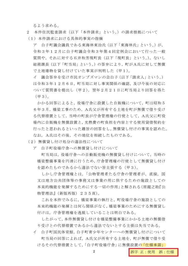 しかし、本件請求はA氏が役場職員であるから監査対象としたのではなく、無償設置には法律上の原因がない、いわゆる不当利得であるから町はA氏に不当利得の返還請求せよという趣旨である。