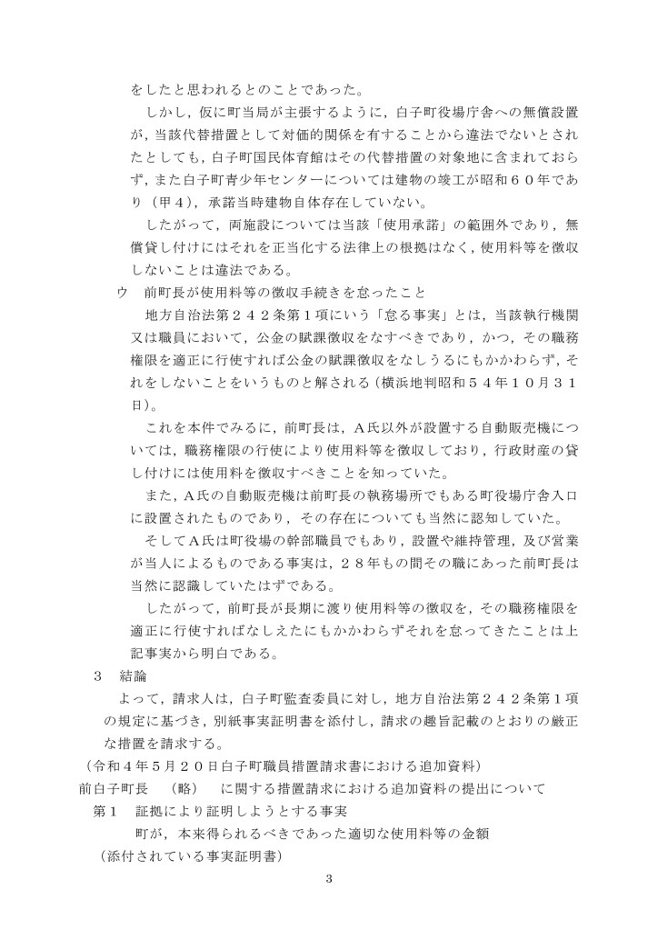 しかし、使用料とは、白子町使用料条例により①使用料と②必要経費から構成されるところ、その「協定書」に記載されている使用料らしき金額の算定根拠をみると、自販機の設置料ではなくその維持にかかる「電気及び水道料金」である。つまり「協定書」によって支払われていたのは②の必要経費のみであって本来支払うべき①の使用料は支払われていなかった。