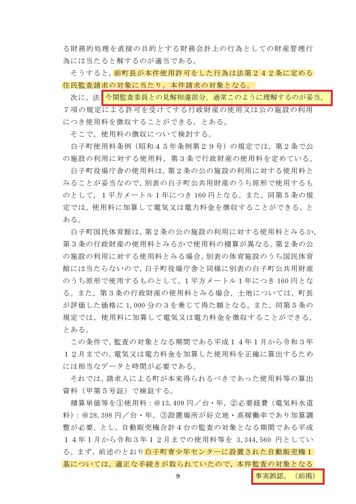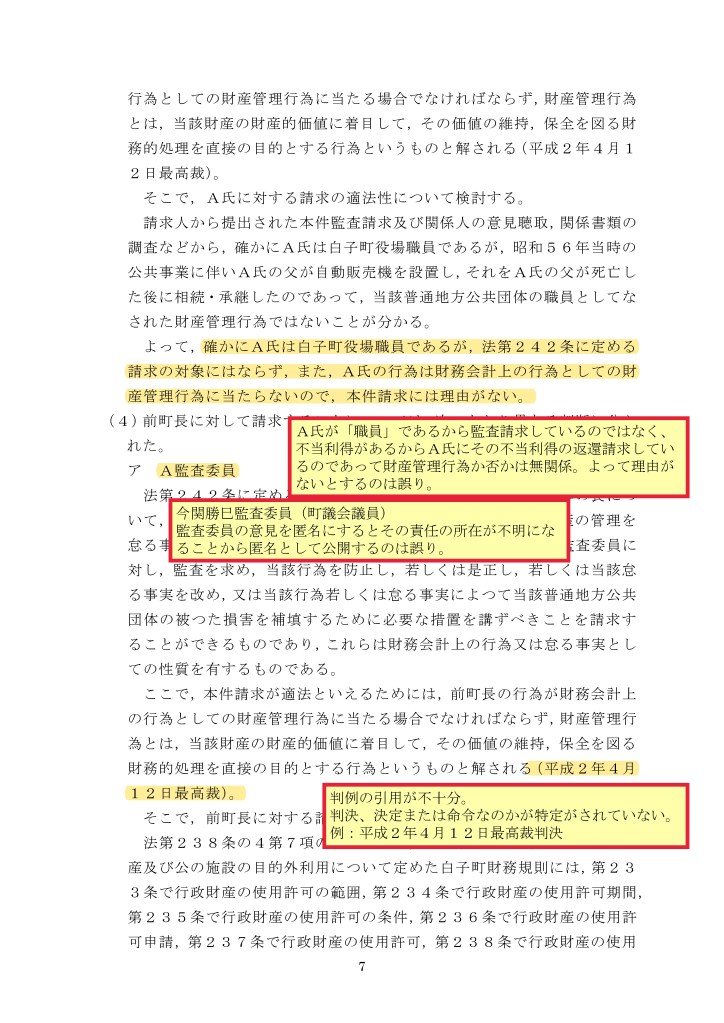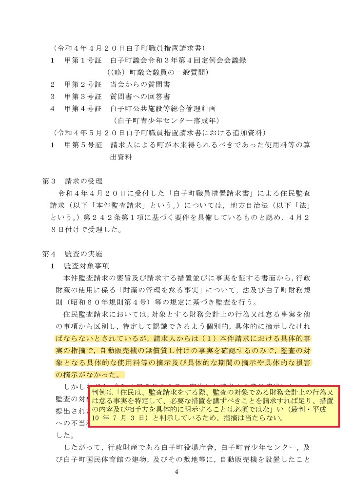 しかし、平成10年7月3日の最高裁判決によると「住民は、監査請求をする際、①監査の対象である財務会計上の行為又は怠る事実を特定して、②必要な措置を講ずべきことを請求すれば足り、措置の内容及び相手方を具体的に明示することは必須ではな」いとしており、本件請求は①自販機の無償設置の事実、②A氏への不当利得返還、および前町長への不法行為に基づく損害賠償請求するよう求めており、①、②要件ともに充足している。