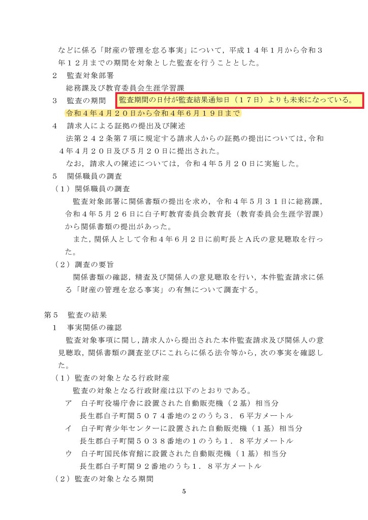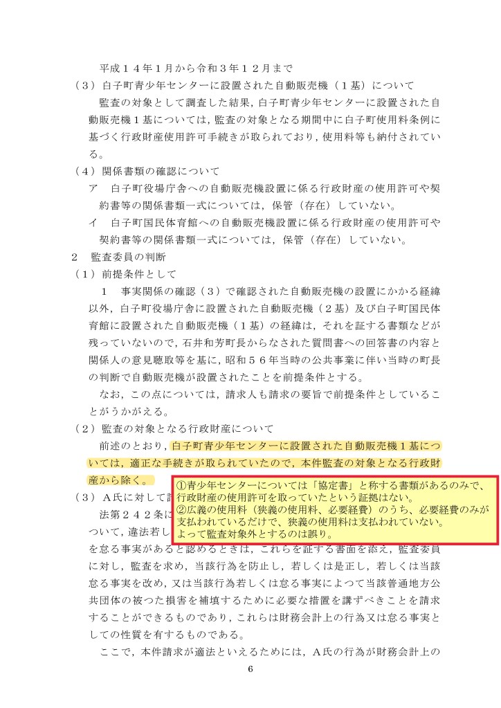 監査結果では「白子町青少年センターに設置された自動販売機1基については,適正な手続きが取られていたので,本件監査の対象となる行政財産から除く。」としているが、監査対象とすべき理由は意見陳述においても指摘をしている。
