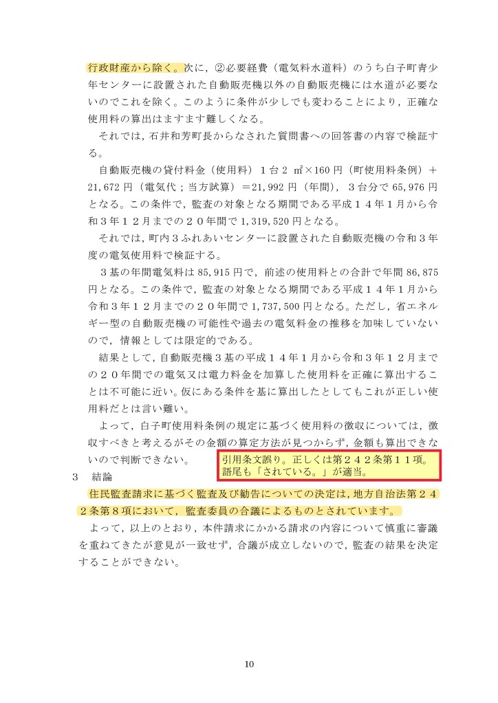 監査結果の結びに監査の合議制規定として地方自治法第242条第8項が挙げられているが、合議制規定は11項である。