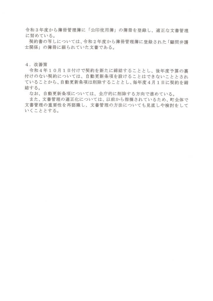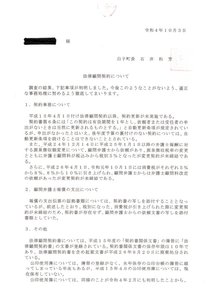 本日(令和 4年 10月 3日)現町長・石井和芳氏より「法律顧問契約について」(A-4版 02ページ)及び関連資料(A-4版 全12ページ)の開示を受けました。❶平成15年4月1日付け法律顧問契約締結以降、19年目となる本年(令和4年9月末)に至る迄、白子町(前町長・林和雄氏)及び顧問弁護士/双葉法律事務所・宮原清貴氏は本来契約更新(1年毎)に実施すべき手続きを未実施。❷本来後年度予算の裏付けのない契約については自動更新条項を設けることが出来ない契約を締結(地方自治法 第 232条の 3違反)。❸弁護士顧問料改定に関する契約の未締結。❹顧問料支払いに関する白子町規定違反。❺「公印使用簿」等文書管理の不備があり、現在、改善策を実施中との回答を得ました。