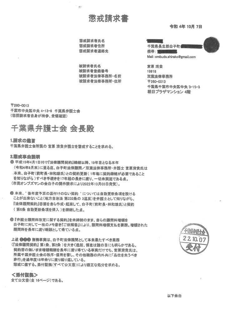 ❶ 千葉県弁護士会会長宛てに、千葉県弁護士会所属の 宮原 清貴弁護士(現・白子町法律顧問)を懲戒することを求める「懲戒請求書」(令和 4年 10月 7日付)を本日、千葉県弁護士会に持参、当日受付押印まで確認しました。
