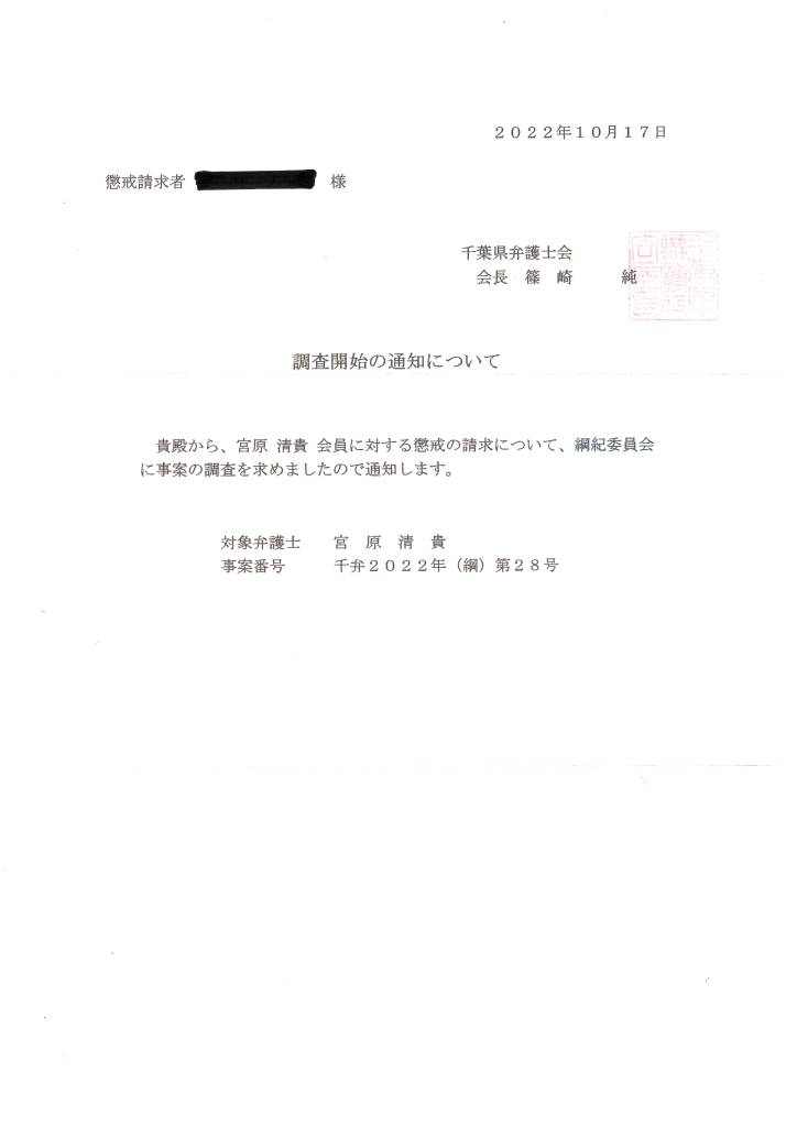 ❸ 2022年10月14日(金)千葉県弁護士会・山本事務局長より電話にて説明が有りました。①弁護士会綱紀委員会が調査を開始した。②宮原 清貴弁護士に調査開始したことを千葉県弁護士会・篠崎 純会長より通知済み。③(通知後)3 週間以内に、宮原 清貴弁護士から綱紀委員会宛てに「答弁書」の提出が必要。④「答弁書」到着後そのコピーを懲戒請求者(市民オンブズマンの会会長)に郵送。⑤懲戒請求者より 2週間以内に「答弁書」に対する意見書(反論等)提出が必要と。このやり取りを行った後に弁護士会綱紀委員会の結論を得る段取りとなっている 由。