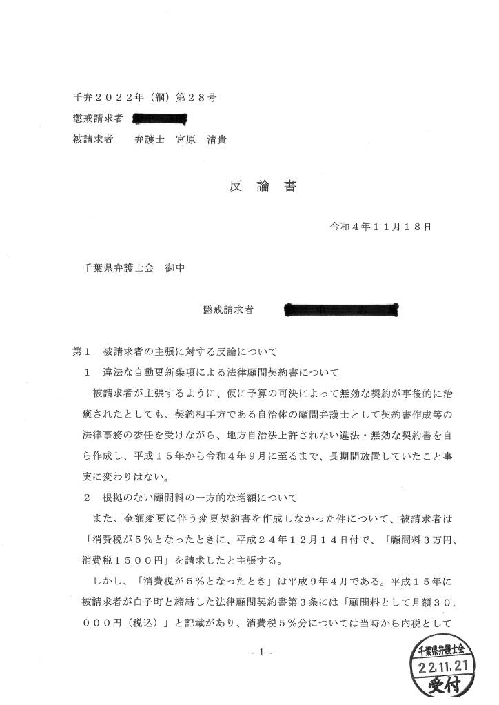 ① 千葉県弁護士会会長宛てに、千葉県弁護士会所属の 宮原 清貴弁護士(現・白子町法律顧問)を懲戒することを求める『懲戒請求書』(令和 4年 10月 7日付)を、千葉県弁護士会に持参、当日受付押印を確認しました。