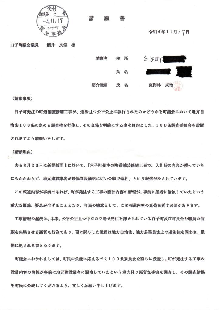 白子町発注の町道舗装修繕工事が、適法且つ公平公正に執行されたのかどうかを町議会において地方自治法100条に定める調査権を行使し、その真偽を明確にする事を目的とした100条調査委員会を設置されますよう請願致します。