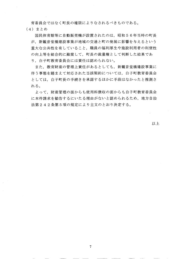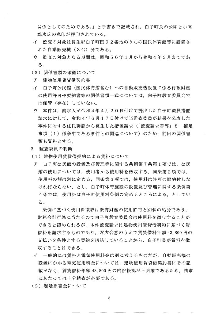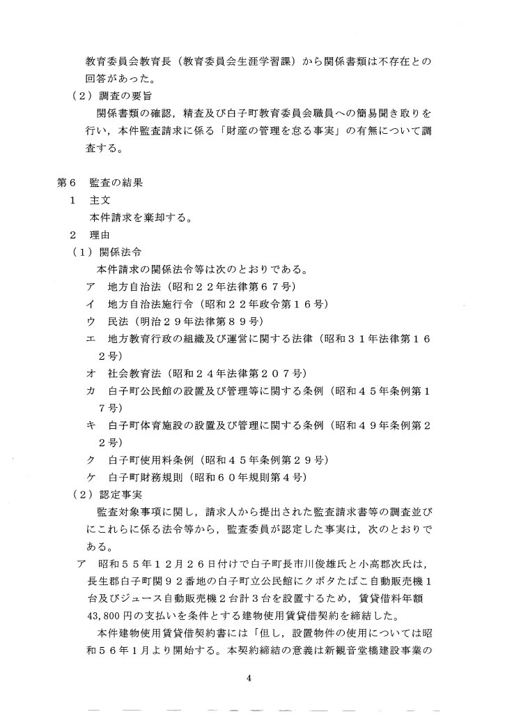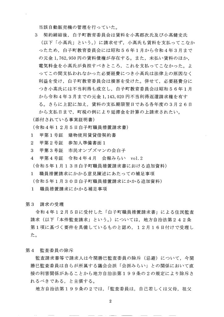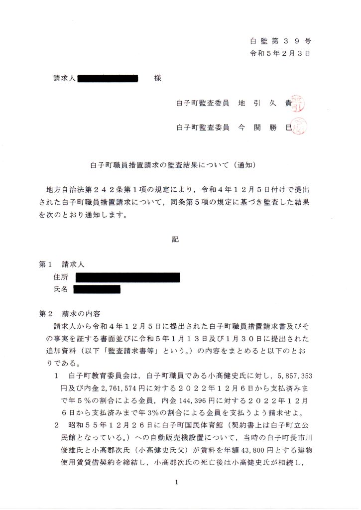 既報、❶<104>【住民監査請求 受理】(自販機事件)〔白子町教育委員会〕☞ 2022年12月05日(月)『白子町教育委員会に関する措置請求書』が白子町監査委員事務部局に受理されました。❷<124>【白子町教育委員会に関する 住民監査請求】☞ 2023年01月13日(金)請求人陳述を実施。❸<135>【白子町教育委員会に関する 住民監査請求】(追加資料)☞ 2023年01月30日(月)白子町監査委員事務部局に追加資料を提出致しました。本日/ 2023年02月03日(金)監査結果(本件請求を棄却する旨)通知を受けました。