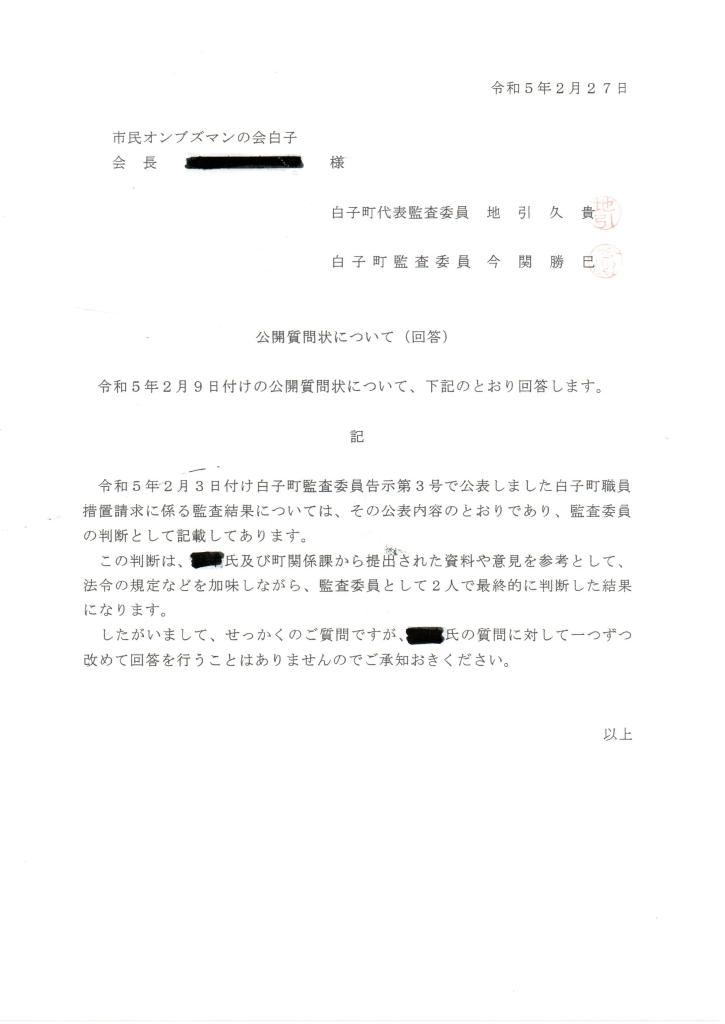 【経緯】既報、<140>【白子町教育委員会に関する住民監査結果】〔地引久貴、今関勝巳監査委員に対する公開質問状〕※2023 年 2月 9日(木)に関して、本日、回答を得ました。公開質問状を発信してから、実働 11日目の回答は下記の通りです。