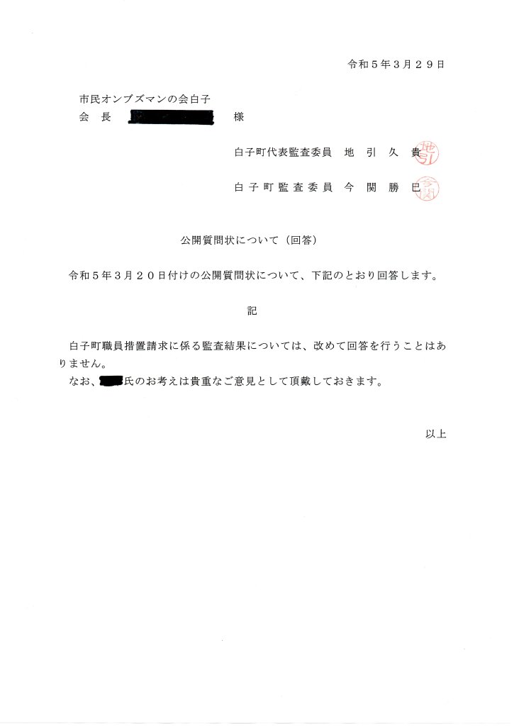 ❸ <144>【白子町教育委員会に関する住民監査結果】〔地引久貴、今関勝巳監査委員に対する(再)公開質問状〕※2023年03月20日(月)を持参提出しました。