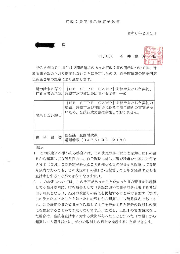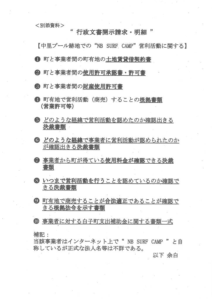 ❸ 幹部職員から「 NB-SURF CAMPと白子町、(株)リック・C・S・Rと白子町との間で、中里プール跡地に関する土地利用に関する賃貸借契約を一切行っていない」「(市民オンブズマンの会白子より)今回の開示請求による指摘を受けるまで、賃貸借契約書を締結をしないまま推移しており、白子町有土地の賃貸借契約管理を放任・放置していた」「早急に契約管理の正常化を目指す」旨謝罪を受けています。
