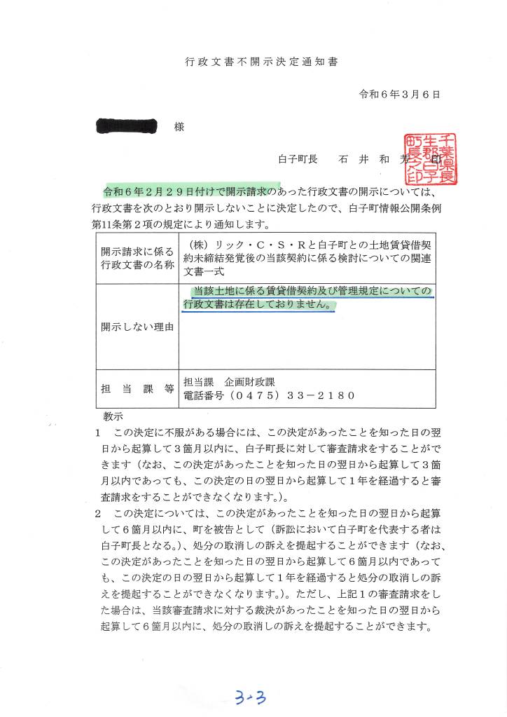 経緯:(株)リック・C・S・R(取締役 堀田光晴)と白子町との土地賃貸借契約書未締結発覚(令和 06年 02月 05日)後の関連資料の開示請求(第情19号)を 02月 29日に実施。