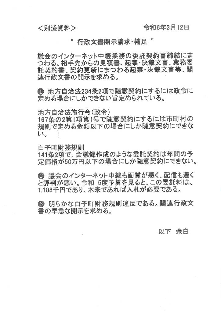 <経緯>(株)会議録研究所と白子町との業務委託契約書締結にまつわる行政文書の開示請求を行いました。既報<171>を参照下さい。その後、白子町議会のインターネット中継業務に関する随意契約が発覚しました。
