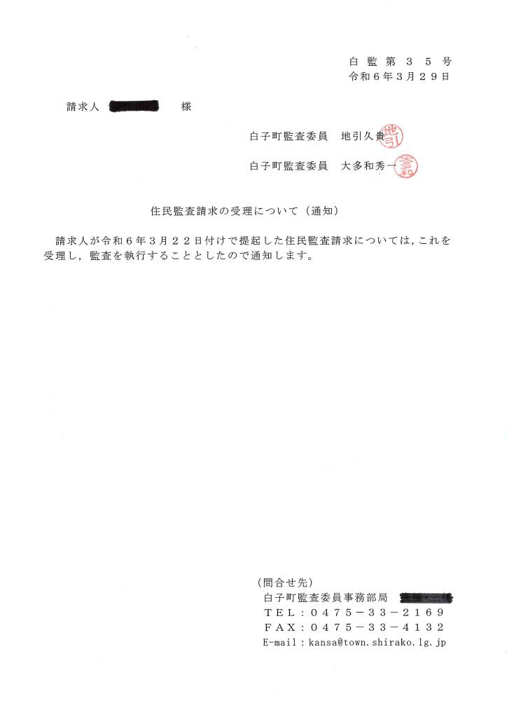 【住民監査請求の受理・通知】〔 白監第 35号 〕