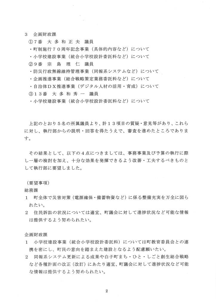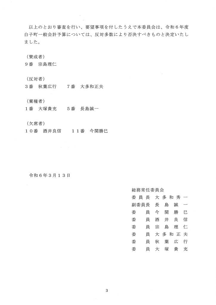 ❸ かかる切迫した事情を勘案して、議会での予算審議(03月13日)を直前に控えた、03月09日に開催された、総務常任委員会(委員長・大多和秀一)で議会として「小学校の統廃合に関して議論が実施された。