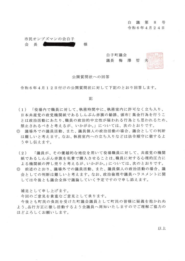 ❿白子町議会・梅澤 哲夫議長より回答を得たので掲示する。
