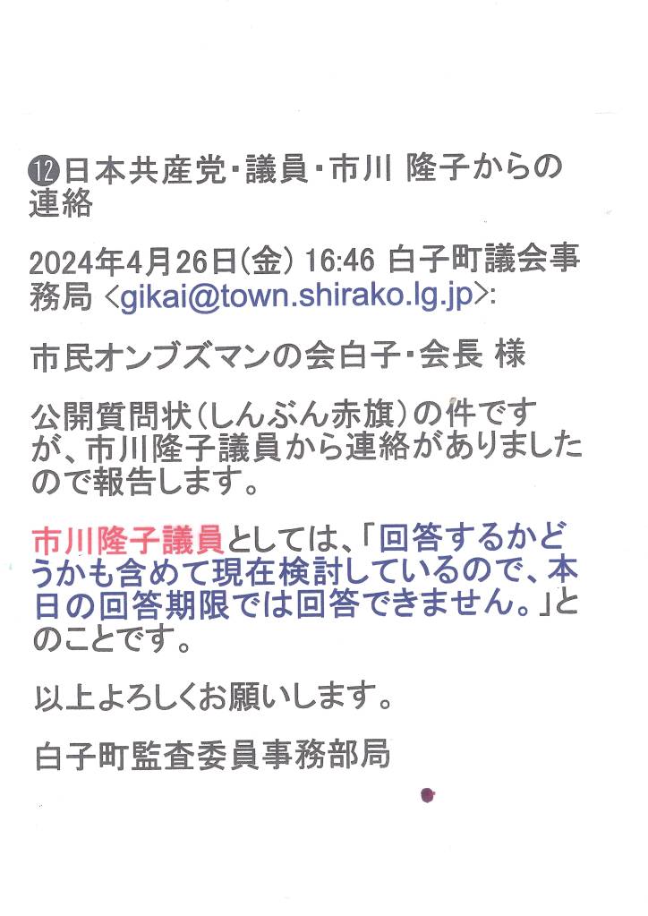 公開質問状(しんぶん赤旗)の件ですが、市川隆子議員から連絡がありましたので報告します。市川隆子議員としては、「回答するかどうかも含めて現在検討しているので、本日の回答期限では回答できません。」とのことです。以上よろしくお願いします。白子町監査委員事務部局