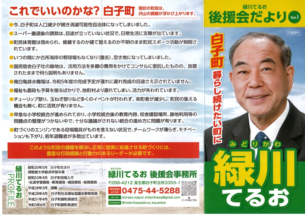 ☞ 民間企業の厳しい経営実態を理解しないまま、自己の選挙戦に際して ” 口当たりの良い ” 、” 聞きざわりの良い ” スーパー誘致 を軽々と訴え、所信表明でも得々と語る緑川輝男氏の姿に( 残念ながら )強い不安と疑問を感じる。白子町民 及び 既に地域住民に貢献している複数の白子企業に対する丁寧な説明を求める。行政トップとしての賢明な選択を期待する。