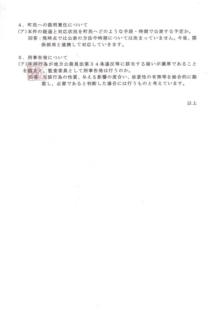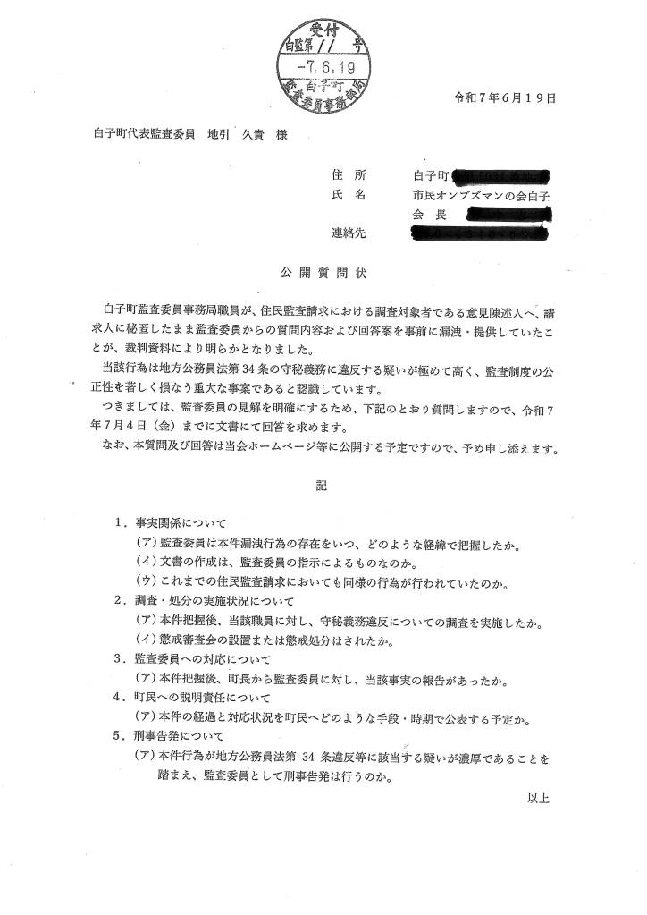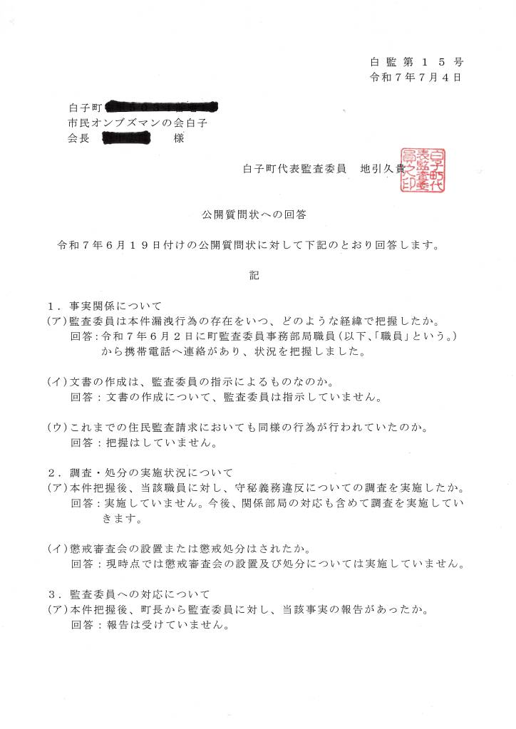 ☞ 白子町より開示された裁判資料( 202ページ )を精読した結果、白子町職員に対する新たな疑惑が発覚。白子町長・緑川輝男氏及び白子町代表監査委員・地引久貴氏(公認会計士・税理士)宛てに公開質問状を 2025年06月19日に夫々提出、受領されました。07月04日(金)迄に文書による回答を求めていましたが、本日(07月04日)両名より夫々回答を得ました。白子町代表監査委員・地引久貴氏(公認会計士・税理士)に対する公開質問状及び回答を当欄にて公開します。