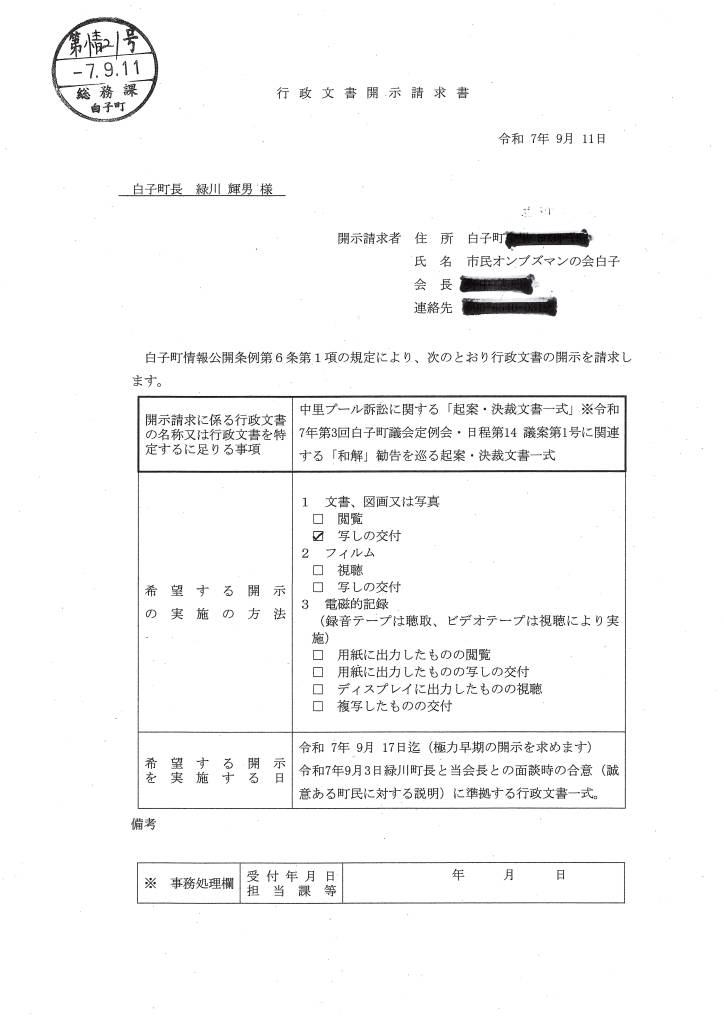 当該係争事案は、当会(市民オンブズマンの会白子・会長)による監査請求が提訴に至る直接の契機となっているため、千葉地裁での和解交渉の行方を注視している。