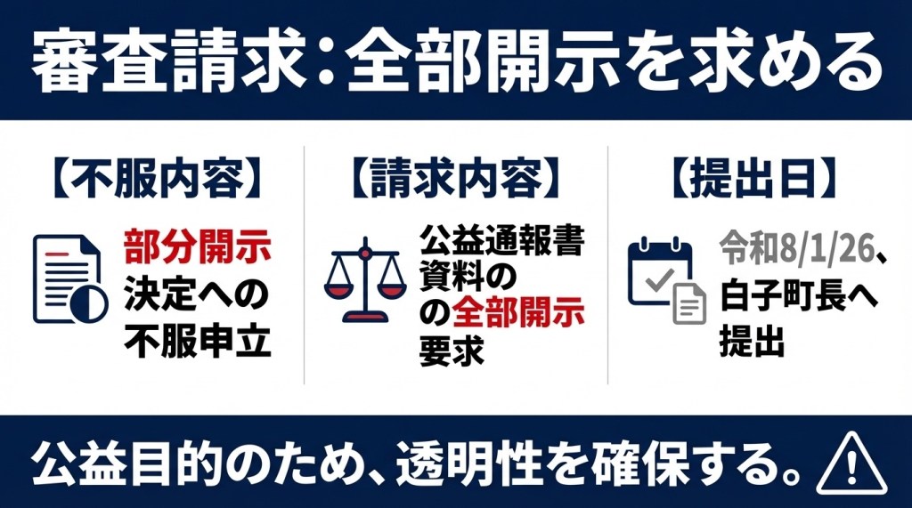 原処分を取り消し、行政文書を全部開示せよ。との裁決を求める。