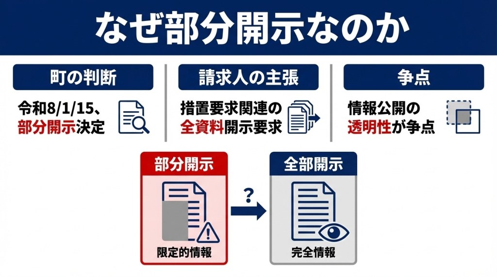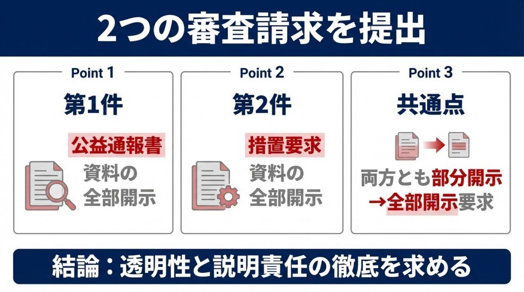 原処分を取り消し、行政文書を全部開示せよ。との裁決を求める。